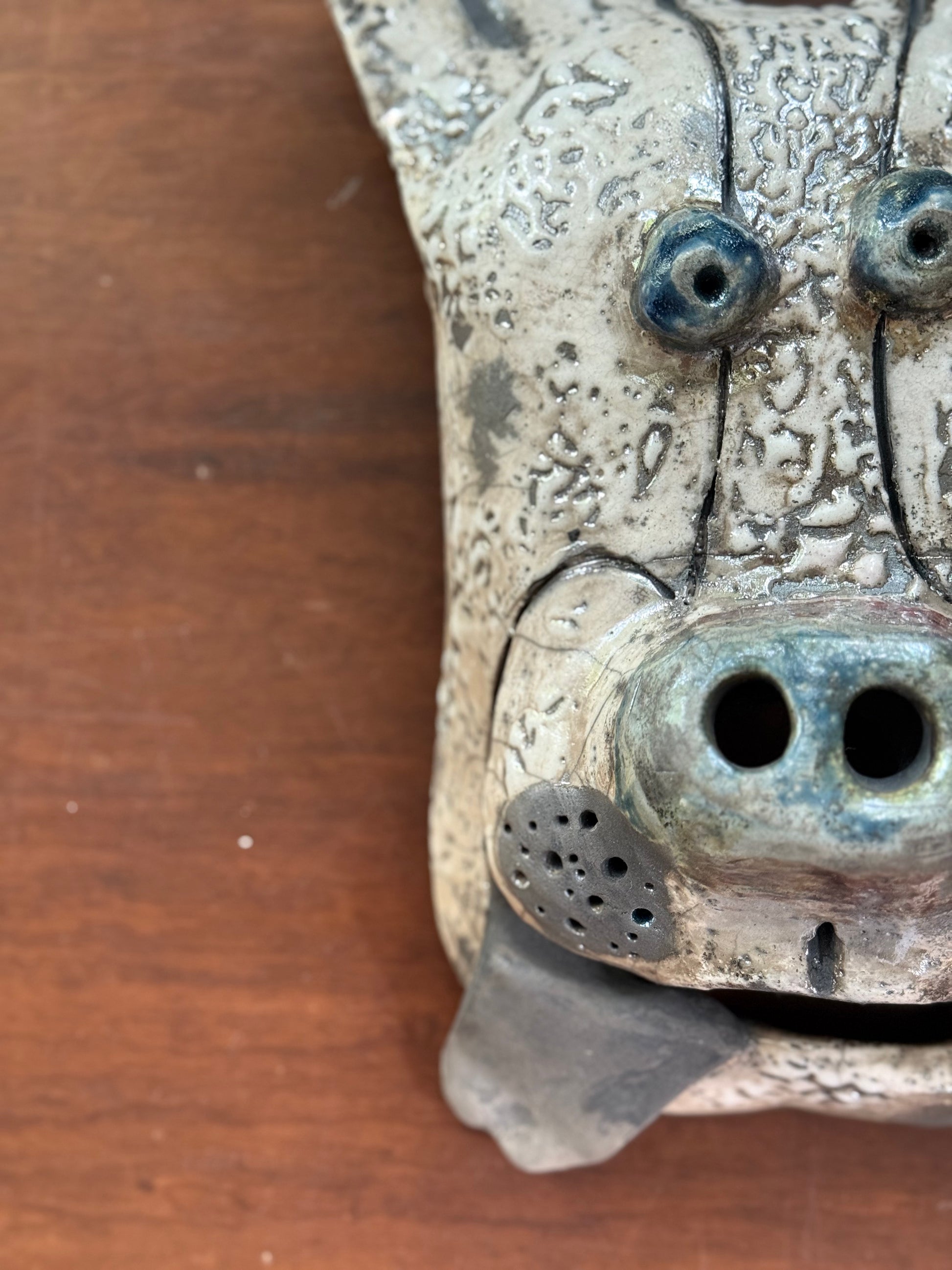 A one-of-a-kind wall-mounted dog mask with its tongue playfully out — crafted using the Raku firing technique that creates beautiful crackling across the surface. With metallic blue eyes and nose catching the light just right, this mask is full of expression and fire-born character. Perfect for adding a touch of handmade charm and canine mischief to your walls.